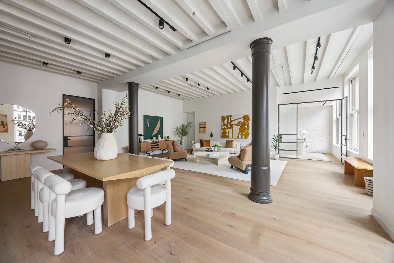 A keyed elevator opens directly into the grand living and dining area, immediately revealing...Spanning over 3,000 square feet, the fifth floor at 62 Reade Street is a four-bedroom, four-and-a-half-bathroom loft reimagined by ODA Architecture within a meticulously restored pair of 19th-century Italianate buildings. The residence showcases original cast iron columns, wide-plank European oak flooring, beamed ceilings, and oversized north and south-facing windows that line the 50-foot width of the building.