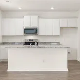 - Kitchen Features: Cabinets White, Kitchen Island, Pantry, Pantry Walk-In, Solid Surface Counters, View to Family Room