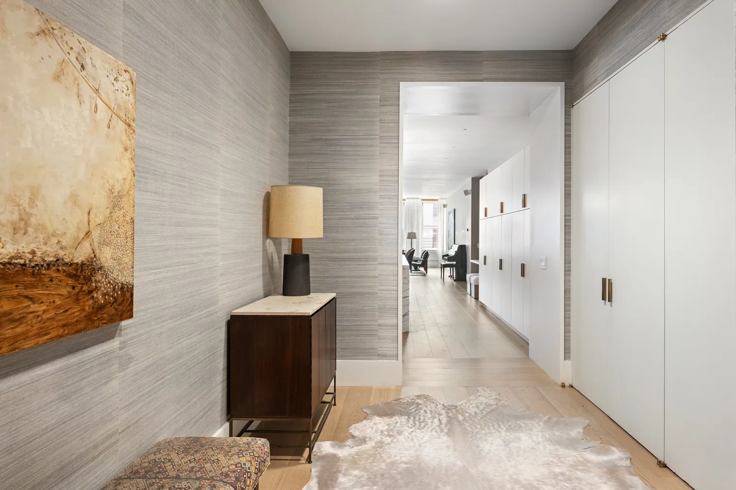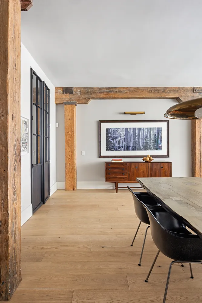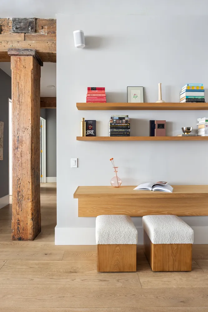 Anchored by Madera flooring and warmed by unlacquered brass hardware, the apartment features a spacious open kitchen with a Lacanche range, Sub-Zero refrigerator, Wolf microwave, Miele dishwasher, and custom shelving and cabinetry. A built-in bench and drawers in the entry, California Closets in the bedrooms, and custom bunk beds with integrated storage in the second bedroom maximize both form and function. The windowed home office is ideal for flexible use as a workspace or guest room.