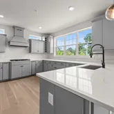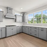throughout the living spaces, Gourmet kitchen with GE appliances, Lausanne Gray Cabinets and