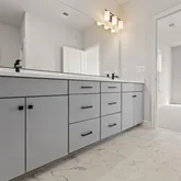 fireplace. The deluxe Owner’s bath features 12x24 Marble Obsession tile, and Painted Gray cabinets