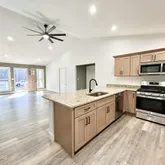 This home has a cozy, open-concept kitchen to living room with vaulted ceilings and massive propeller like fan. Kitchen has large granite counter top with a bar style design for an eat in kitchen with plenty of counter top space. Cabinets are a soft brown color that are soft-closing. Stainless steel appliances Gas Stove, microwave, and dishwasher and refrigerator. Guest bedroom and bonus room with closets and ceiling fans. Guest bath has tub/shower combo and a back-lit mirror. Laundry/Mud room with closet storage. Yard seeded and straw with 2 red maple trees planted in front yard. Front Deck is Trex Decking. This is a custom spec house 1-year builder's warranty plus manufacturer warranties transfer to buyer. There will be an option to add RV parking at an additional cost. There is plenty of room to add a detached garage. Agent/owner