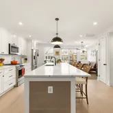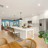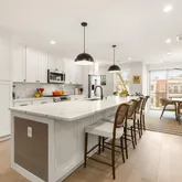 The main level features an open floor plan with soaring ceilings, recessed lighting, and Bluetooth speakers throughout creating the ideal setting for both everyday living and entertaining. The chef’s kitchen is a true centerpiece, featuring floor-to-ceiling cabinetry, stainless steel Bosch appliances, and a gas range for cooking enthusiasts. An expansive island anchors the space, offering generous prep space, storage on both sides, and comfortable seating for casual dining or gathering with friends.