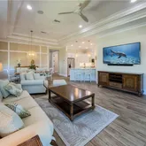 The home features top-of-the-line upgrades including premium cabinetry, upgraded flooring, crown molding, and refined finishes throughout. The open-concept design flows seamlessly to a stunning outdoor living space, where a private lanai with saltwater pool creates the perfect setting for relaxation and entertaining in a peaceful natural backdrop.