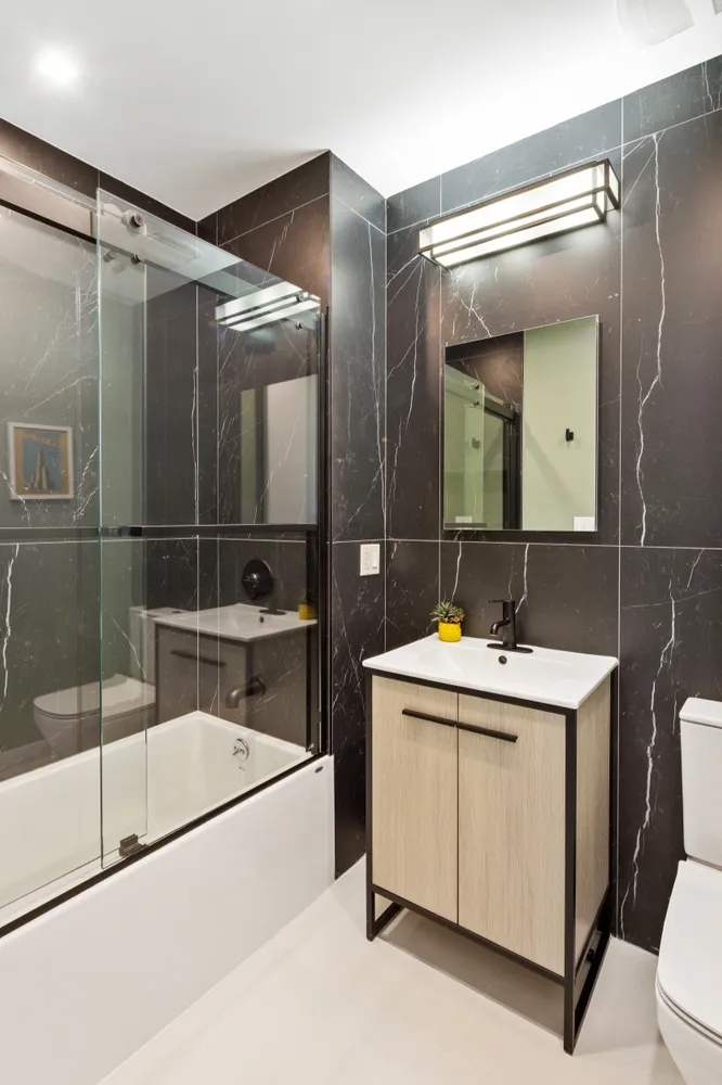 Two generously proportioned bedrooms are conveniently tucked away for privacy at the rear of the apartment. With entirely unobstructed views, these rooms enjoy beautiful sunlight and an iconic Brooklyn backdrop. The large primary bedroom comfortably fits a king sized bed and home office with ample closet space. The 2nd bedroom is also generously sized allowing for queen bedroom furniture. The bathrooms offer a spa-like experience with custom vanities, beautiful tiles. A deep soaking tub in one and an elegant shower in the en-suite.