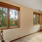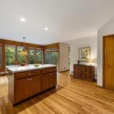 The main level is designed for both everyday living and entertaining. Interconnected living and dining spaces are anchored by a traditional fireplace, creating a warm focal point. A large, open kitchen features abundant natural light, a wall of glass connecting to the outdoors, generous cabinet and counter space, and a spacious pantry. The kitchen opens to a large deck overlooking the partially wooded property. A well-appointed office with built-ins provides a quiet workspace, while a den/family room offers a serene setting to enjoy the surrounding mature trees. A powder room completes this level.