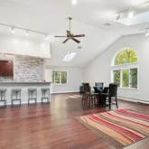 perfect for entertaining, featuring a custom wet bar and sliding glass doors that lead out to the