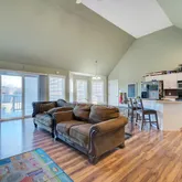 THE HOME: Light and bright Cape Cod–style home offering 3 bedrooms and 2 full bathrooms with a welcoming, open feel throughout. Hardwood and carpeted flooring blend comfort and style across the living spaces. The living room is a true focal point, featuring a wood-burning fireplace with a statement mantel, vaulted ceiling, wall of windows, and a charming bump-out dining area. A door leads directly to the deck and backyard, creating seamless indoor-outdoor living. The open-concept kitchen is designed for both everyday living and entertaining, showcasing beadboard cabinetry, stainless steel appliances, and a center island with additional cooktop, storage, and seating. The primary bedroom retreat boasts a vaulted ceiling, plush carpeting, a striking palladium window, and sliding doors to a private porch. The ensuite bathroom offers a spa-like experience with a soaking tub, step-in shower, and dual-sink vanity. Two additional bedrooms and a full bath complete this inviting Cape Cod home. In addition to the main house, the property includes a pole barn, mobile home and detached garage with apartment above, ideal for guests, staff or additional rental income.