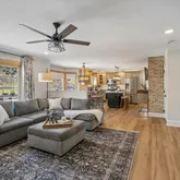 Inside, natural light fills the bright and airy interior. The living room provides a comfortable space to relax or gather with friends before opening to the kitchen and family room, designed for both everyday living and entertaining. A limewashed stone gas fireplace anchors the space, while the kitchen features elegant cabinetry with crown molding, distinctive soapstone countertops, stainless steel appliances, and a generous island ideal for casual meals or conversation. A built-in desk area adds a convenient space for staying organized.