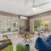 This home has solar panels to make make cooling off in the summer months very affordable. The three car garage has built in storage cabinets and plenty of space for your golf cart so you can hop in and drive to the 1st tee, country club, on site restaurant and bar, pickleball and tennis courts, and the large resort sized pool with food and drink service. Unlimited golf for two is included with the low HOA fees. Experience the perfect blend of country club living and peaceful desert serenity in this Coachella Valley gem.