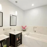 adorned with elegant marble tile and rainhead shower spouts, further enhancing the home's refined design. New ceiling fans complement the
