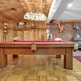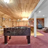 - Room Description: game family room with free standing wwod stove