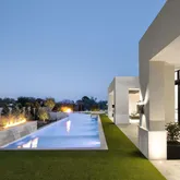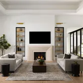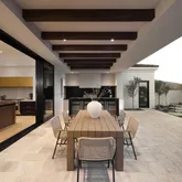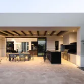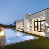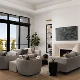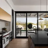 Outdoors, the backyard has been designed as a private oasis. A resort-style indoor-outdoor kitchen, a 64-foot lap pool with spa, and expansive lawn space create the perfect setting for both relaxation and entertaining.