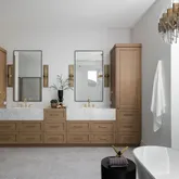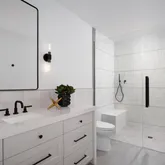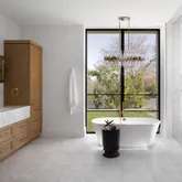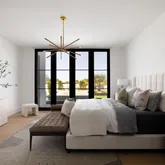 The primary suite is a true retreat, featuring a spacious walk-in closet, a personal coffee bar, and Carrara marble floors and slabs. The ensuite bath evokes spa-like serenity with a freestanding tub, oversized walk-in shower, and designer finishes.