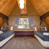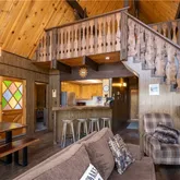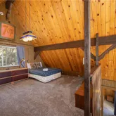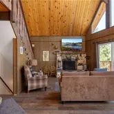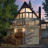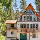 Vaulted ceilings and a dramatic wall of windows bring in natural light and frame tree-filled views, while the stone fireplace adds a cozy focal point for the main living area. The open loft overlooks the living room and serves as a versatile flex space, ideal as a fourth bedroom, reading nook,...A classic mountain A-frame with a touch of chalet charm, this 3-bedroom, 2-bath home is positioned just west of Big Bear Village, putting the lake, dining, shopping, and four-season adventure within easy reach.
