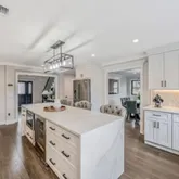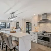 - RoomDescription 1: Gourmet Kitchen with Commercial Grade Stainless Steel Appliances. Built-in Wine Cooler and Microwave. Huge Quartz Waterfall Center Island
