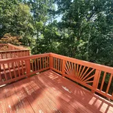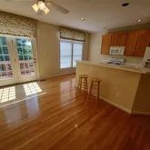 with wood floors. Kitchen has large eat-in area and walks out onto private deck with view of the trees and