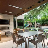 - Exterior Features: Attached Grill, Balcony, Built-in Barbecue, Covered Patio/Porch, Dog Run, Rain Gutters, Lighting, Misting System, Mosquito Mist System, Outdoor Grill, Outdoor Kitchen, Outdoor Living Center, Playground
