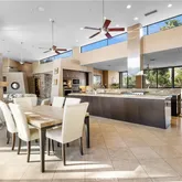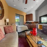Enjoy incredible sunsets and sunrises from this dream vacation home — a one-of-a-kind work of art. With sweeping views of 10,000 foot high snow covered mountains and a private golf course, this 9-bedroom, 7,800-square-foot luxury home juts up from the desert landscape as the crowning jewel of this multi-million-dollar neighborhood, Westgate. Westgate is a gated neighborhood within a private country club, and has 0.5 to 1.5 acre estate homes on the golf course. Truly unique. As an internationally award winning home for its architecture. Great for large family gatherings, business events, cultural events, golf outings, celebrations, and romantic getaways. The home features light-flooded living spaces, high end finishes, patios off every room in the home, a pool and spa with a swim-up pool bar, and lush bedroom suites. With TEN massive 10 foot high pocket sliding glass doors (disappearing walls of glass), this home redefines indoor/outdoor living at its finest, bring the surrounding landscape into the home from every room in the house. Artfully designed spaces invite and delight. Modern Mansion Oasis can easily accommodate up to 24 guests. The main house includes 6 bedrooms (5 with en suite baths); the guest house features another 3 bedrooms and 2 ensuite baths (one jack-and-jill for the third bedroom), for a total of 9 comfortable sleeping areas. You’ll arrive via the estate’s private, circular motor court, outfitted with tall Basalt column sculptures, cascading water features, and glass bridges from the motor court to the front door. The entryway is reminiscent of a five-star resort — and the five-star experience doesn’t stop there. Extraordinary attention to details abounds throughout the residence. The main living space features a relaxing home theater and connects to an open kitchen with state-of-the-art appliances. Sunken wet bars, a catering kitchen/butlers pantry, and an outdoor grill and bar make entertaining a breeze. The estate’s various outdoor fireplaces, exquisitely landscaped plots, and covered lounging areas lend themselves well to relaxing and tasteful events. Minimum 30-day rental is required.