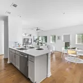 The main level features wood flooring throughout and an open kitchen with quartz countertops, stainless steel appliances, and a gas range. The light-filled living and dining areas open to a fenced yard with a deck and mature live oak canopy. Also on the first floor are a powder bath, laundry room, and access to an oversized two-car garage. Upstairs, the primary and secondary bedrooms are arranged around a spacious secondary living area suitable for a media or flex space. The primary suite includes dual closets and an en-suite bath with dual vanity and walk-in shower.