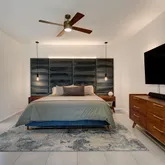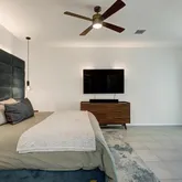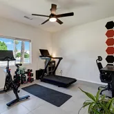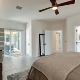 Inside, the open-concept layout is perfect for modern life, featuring solid core doors (2023), upgraded lighting, a custom-designed walk-in primary closet, and stylish ceiling fans throughout. The home has been smartly enhanced for energy efficiency, including owned 32 solar panels and a Tesla Powerwall, a water softener system (2022), and a 5-ton HVAC system (2024). The garage is equipped with its own AC split system and a Tesla EV charger, making it ideal for a gym, studio, or year-round workspace.