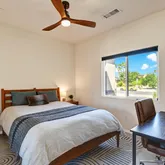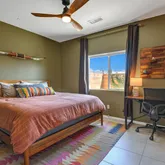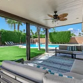 Work your way outside to a private oasis with a sparkling pool and spa, a covered patio with an outdoor fan, and a refreshed misting system (2022). The backyard also features a rear gate with RV access and storage, offering rare flexibility for additional parking and desert toys.