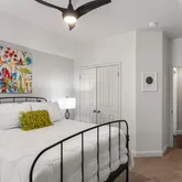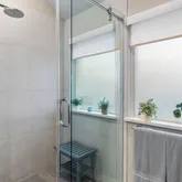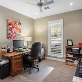 The spacious owner’s retreat is filled with natural light and offers a spa-like bath complete with a frameless glass walk-in shower, built-in hamper, drawer with electrical outlet, and a generous walk-in closet. Secondary bedrooms are well-sized, with one featuring a thoughtfully designed built-in desk, lighting, and electrical, ideal for a home office or flex space.
