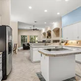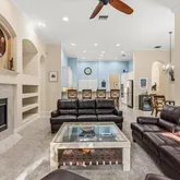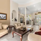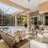 A gracious foyer introduces separate formal living and dining rooms. The inviting family room, featuring a gas fireplace and custom built-ins, flows seamlessly into the open kitchen which features cooktop island, stainless steel appliances, 42" cabinetry, a breakfast bar, and casual dining nook. Step outside to the screened lanai, where the pool, spa, outdoor kitchen space, and covered area create an ideal setting for poolside relaxation or entertaining in style.