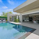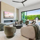 Designed as the heart of the home, the ambiance blends interior and exterior living with ceramic pavers, a fireplace, lap-pool, and retractable blinds, while...Striking architecture, refined materials, and seamless indoor-outdoor living define this exceptional residence within a 24/7 guard-gated community at the Ritz. A dramatic double-height glass entry framed by floor-to-ceiling windows opens to a stone-clad foyer and soaring interiors where sightlines extend through the home into the lush backyard.