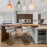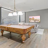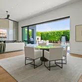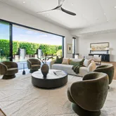 Designed as the heart of the home, the ambiance blends interior and exterior living with ceramic pavers, a fireplace, lap-pool, and retractable blinds, while expansive glass walls connect surrounding spaces in breathtaking fashion. The chef's kitchen features a waterfall island, sleek European frameless cabinetry, and a full suite of Gaggenau appliances, complemented by a spacious pantry and elegant dining bar designed for entertaining. The great room is anchored by a floor-to-ceiling stone fireplace and sound-absorbing ceiling.