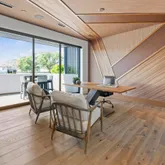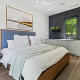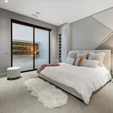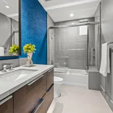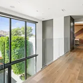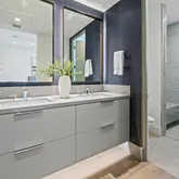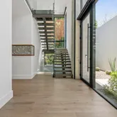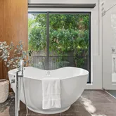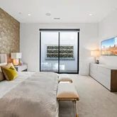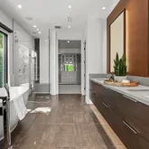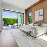 The primary suite offers a sophisticated retreat with walls of glass opening to the courtyard and a spa-inspired bath featuring floating vanities with Crystal Quartz, a freestanding soaking tub, and a zero-entry rain shower.