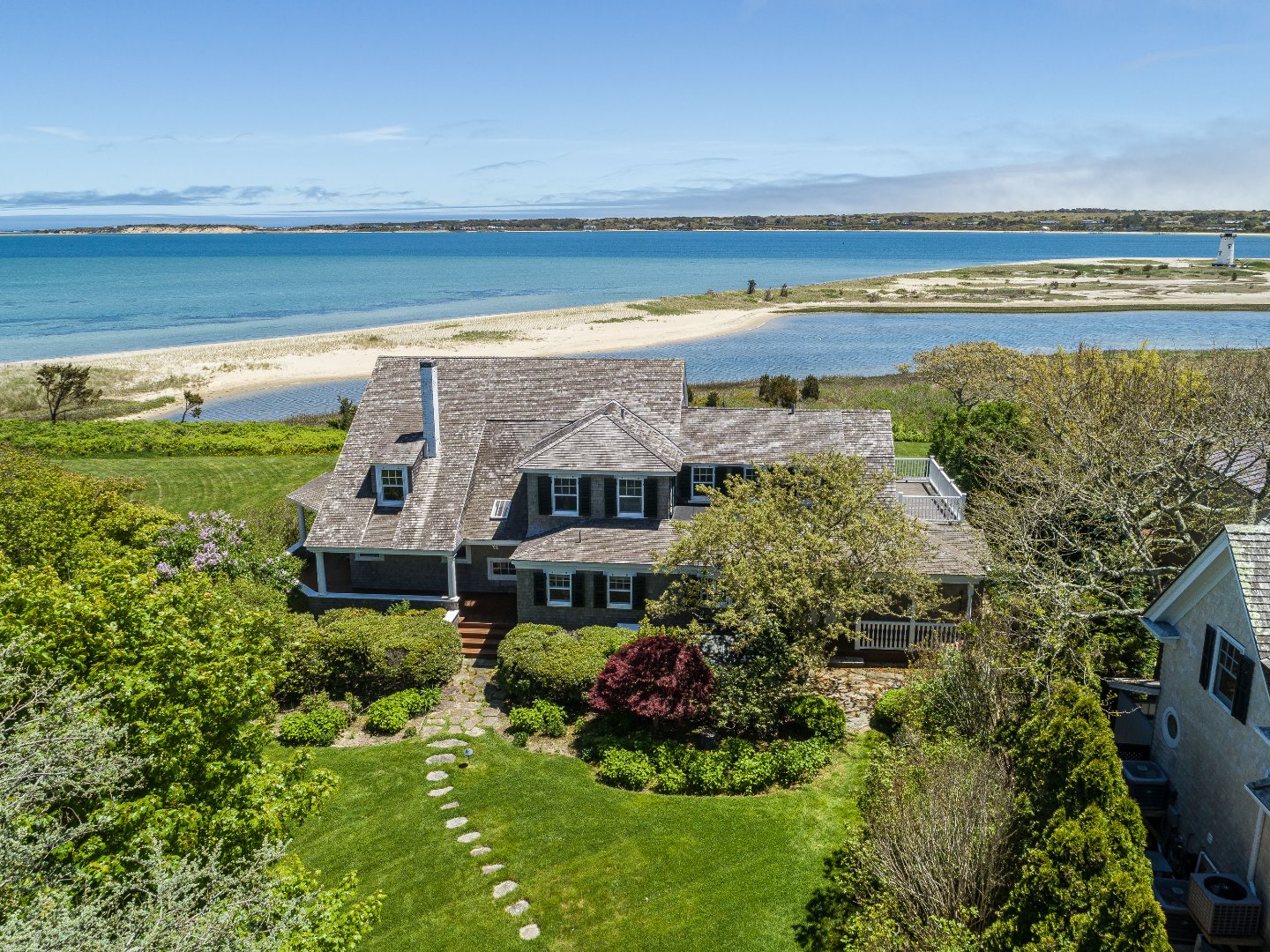 Truly a once in a lifetime chance to live in one of Edgartown's most desirable locations. Only one of five homes in this exclusive enclave, you have a front row seat to watch the activity of the outer harbor, lighthouse, sailboats, Chappy Beach Club-a 180 degree view. This home embodies all of what in-town Edgartown living is, a quiet winding street, waterfront, walk to town and the beach. Easy in and out of town access without the hassle of traffic. This classic Shingle Style home has been meticulously...Truly a once in a lifetime chance to live in one of Edgartown's most desirable locations. Only one of five homes in this exclusive enclave, you have a front row seat to watch the activity of the outer harbor, lighthouse, sailboats, Chappy Beach Club-a 180 degree view. This home embodies all of what in-town Edgartown living is, a quiet winding street, waterfront, walk to town and the beach. Easy in and out of town access without the hassle of traffic. This classic Shingle Style home has been meticulously restored to preserve its exquisite design details. There is a lovely living room with grand views over the water and an intimate seating area near the fireplace. You will find a spacious open dining room to a beautifully paneled billiards room and half bath. The kitchen is well designed and feels open to the house but does allow for privacy if one wanted, a clever design. There are multiple bedroom suites upstairs for generational living as well as a privately sited guest cottage. A two car garage has ample space for boat storage and cars. Enjoy all that Edgartown has to offer with the ease of this location and historic beauty of this home.