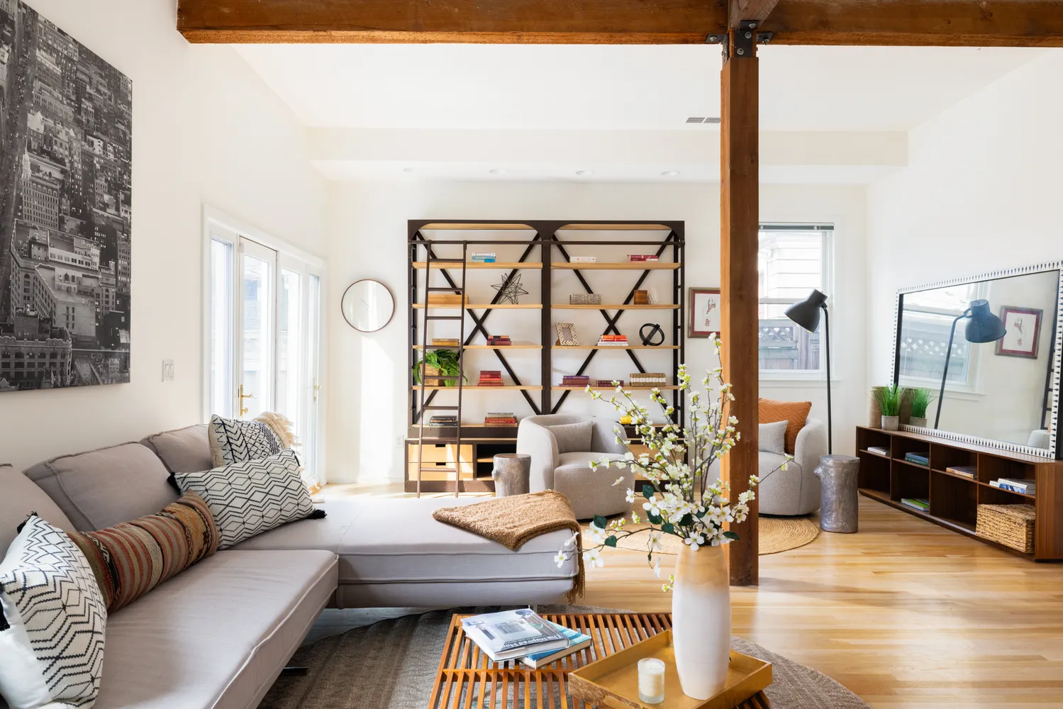 Inside, four bedrooms with vaulted ceilings and 2.5 baths are inspiring, comfortable spaces with volume and flexibility. The living room is a standout—featuring 10.5' ceilings, exposed beams, a working wood-burning stove, and French doors that open directly to the outdoor environment, creating a dramatic and seamless indoor-outdoor connection. A 2021 gut renovation by Feinmann Inc. introduced a new primary bathroom and fully reimagined guest bathroom, alongside updated plumbing, fixtures, and electrical. The kitchen features granite counters and stainless appliances, positioned to connect easily to both living and outdoor spaces.