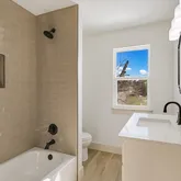 Upstairs, the primary suite serves as a private retreat, highlighted by oversized picture windows framing treetop and distant sky views. The ensuite bath features a dual vanity with quartz countertops, modern black fixtures, and a walk-in shower with subway tile and frameless glass. Two additional bedrooms share a spacious secondary bath with a tub/shower combination and full-height tile surround for a refined finish.