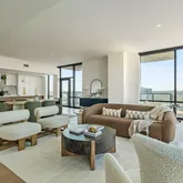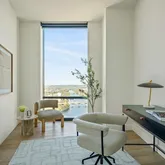 The open-concept layout seamlessly connects the living, dining, and kitchen areas, extending to a spacious patio ideal for outdoor entertaining. The east-facing primary suite includes a cozy seating area and a spa-like bathroom with dual vanities, a soaking tub, a glass-enclosed shower, and a custom walk-in closet. Smart home automation features include built-in speakers and motorized shades throughout. This residence includes three reserved parking spaces conveniently located on the first level of residential parking.