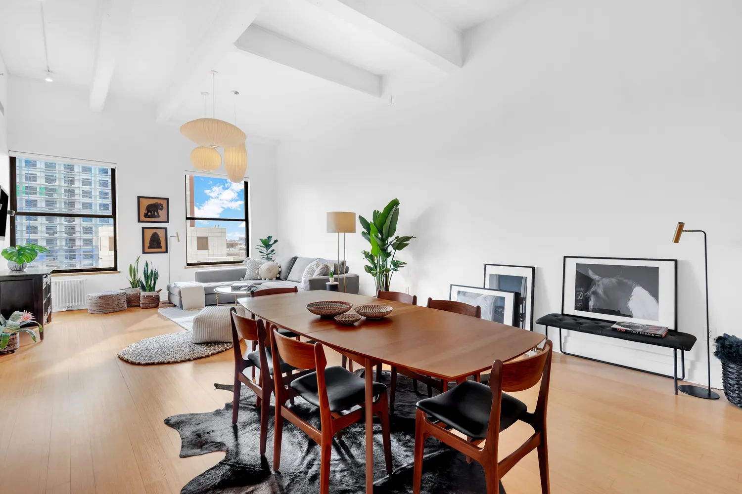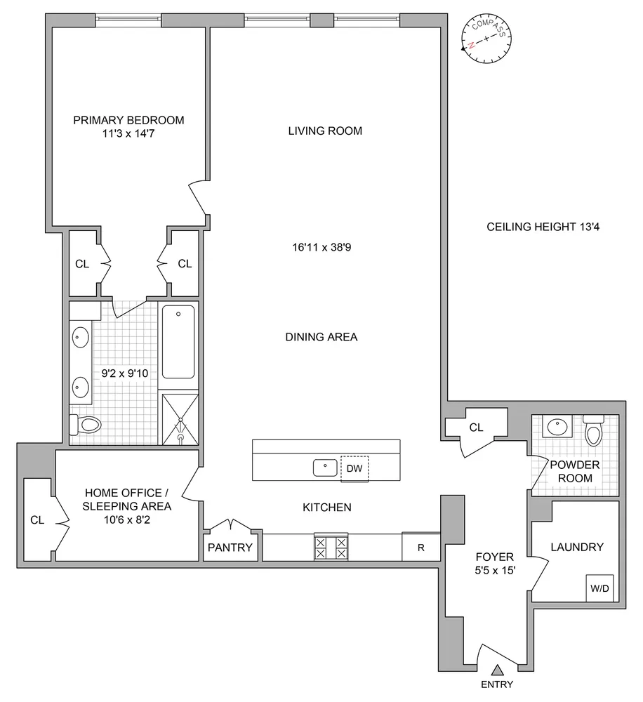The inviting foyer leads to an expansive great room with an open gourmet kitchen. The voluminous space is nearly 18 feet wide by 40 feet long. The kitchen is every chef’s delight with professional-grade appliances and endless counter space. The living and dining area is perfect for a cozy night for two or a glamorous reception for 30. The primary suite is a true get-away with an oversized bedroom, proper dressing area with large closets, and spa-quality bath. Additionally, there is a substantial home office that has its own large closet and can double as a guest sleeping area. Completing the loft are 13-foot ceilings (the building’s highest), 7-foot oversized windows, environmentally-conscious bamboo floors, and central air.