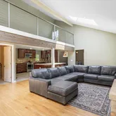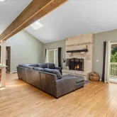 - Room Description: Light-filled living area showcasing vaulted ceilings, skylights, and a wood-burning fireplace that adds warmth and character.