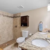 - Room Description: Full bathroom featuring a custom 6-foot granite walk-in shower, dual vanities, and a toilet with upgraded finishes.