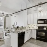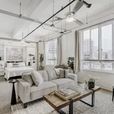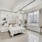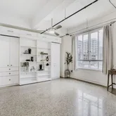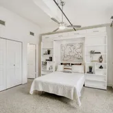 - Room Description: The bedroom is open to the living area, studio style, and features a built-in Murphy bed with sophisticated bookcases and storage above - pull the bed up during the day for extended living space; Featuring a spacious closet for storage; As with the living area, the bedroom sits under exposed beams and conduit, and offers large windows that open and frame downtown views