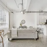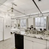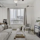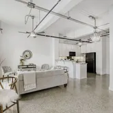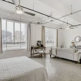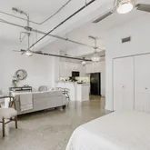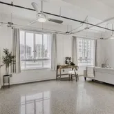 - Room Description: Studio style floor plan with terrazzo tile floors; Exposed beams, conduit, and ductwork throughout the condo; Large windows open so you can bring in fresh air while also bathing the entire condo in natural light and showcasing downtown views; A modern ceiling fan blends well with the overall aesthetic while neutral white paint brightens the space considerably