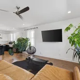 The second floor is where life happens. Open-concept living, dining, and kitchen all flow together, anchored by a secondary balcony that pulls the outdoors in. A guest bedroom and full bath round out the level — perfect for visitors or a dedicated home office.