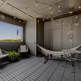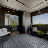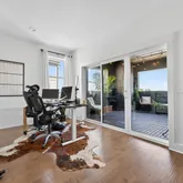 Tucked just ten minutes from downtown and the airport, this one sits in one of the city’s most exciting growth corridors. Bonus — the community comes with a pool and dog park, too. Let’s take it from the top. The third floor is the owner’s retreat, and it’s a whole experience. Color-drenched walls give it that moody, tucked-away feel — the kind of space that actually makes you want to unwind. The suite includes a spacious walk-in closet and a beautifully designed bathroom with an oversized shower. Just outside the suite, a flex space — currently used as a home office with a light workout setup — connects you to a private terrace that’s also color-drenched, because why stop a good thing. That flex area could easily become a reading nook, nursery, or whatever your life calls for.