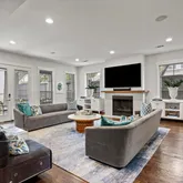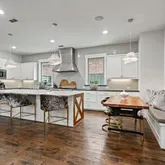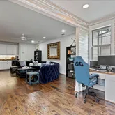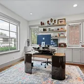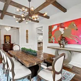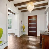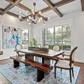 A beamed entryway sets the tone for this stylish home, where every detail blends comfort and sophistication. The gourmet kitchen features Thermador appliances, marble countertops, and built-in seating, perfect for both everyday meals and effortless entertaining. The kitchen opens to the inviting family room with custom built-ins and a gas fireplace.