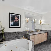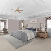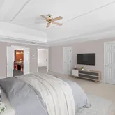 The spacious primary suite offers a tray ceiling, three closets, and a private sitting room. The en-suite bath includes a walk-in shower, jetted soaking tub, separate bidet, and generous vanity space.