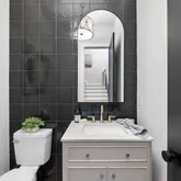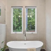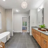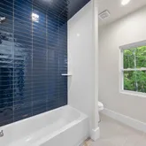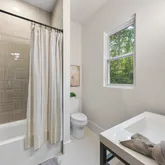 Indulge in the luxurious spa-like primary bath that showcases stunning fluted doors and sleek concrete quartz countertops, complemented by a spacious stand-alone tub—perfect for unwinding after a long day.