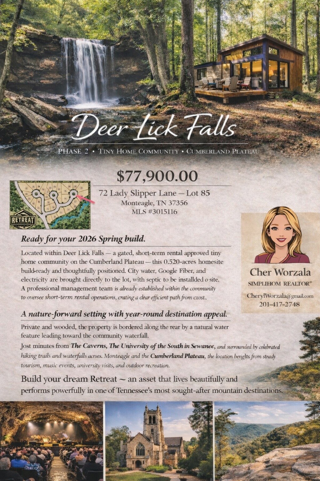 Check the Links below in this listing for comprehensive overview of property and area! Lot 85 in DeerLick Falls Phase 2 offers a rare opportunity to step directly into mountain living and short term rental income without waiting on future development. Located in a gated, short-term-rental-approved tiny home community, this heavily wooded and ultra-private parcel is already positioned for immediate use and enjoyment. Anchored by a serene stream flowing toward a natural waterfall and bordered by protected green space and a quiet walking path, the property offers lasting privacy with no future building behind you — just nature, water, and peace. Mature trees, moss-covered stones, and the sound of moving water create a setting that feels established and complete, not speculative. Whether you plan to build a personal mountain retreat or create a thoughtfully designed short-term rental, this lot allows you to move forward now. Owners may partner with Retreat Management and select from a curated offering of Clayton prefab tiny homes or bring a custom design, with added financial and listing advantages available once built. Close proximity to The Caverns music venue and Sewanee University for your Airbnb clients. DeerLick Falls provides access to scenic trails, shared common areas, nearby waterfalls, and easy proximity to local music venues, hiking, and outdoor recreation.