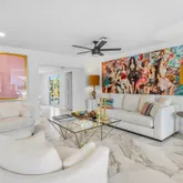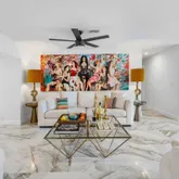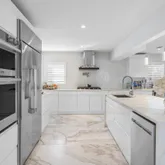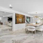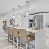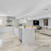 The spacious living area features exquisite oversized rectangular marble flooring throughout the entire downstairs. The first floor includes two large bedrooms, plus a den/office space, and two updated full bathrooms with chic design and updated fixtures. The gourmet kitchen is a chef's dream, equipped with top-of-the-line DACOR appliances, impeccable marble countertops and a striking center island perfect for entertaining. High vaulted ceilings accentuate the main living space bringing an abundance of light, showcasing gorgeous water views that can be seen from every angle.