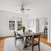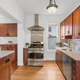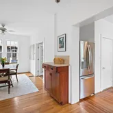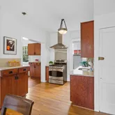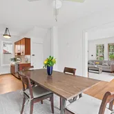 Continue into the heart of the home to the dining room, off of which is a main-level bedroom (or study, or playroom!) with windows on two sides, generous bookshelves, access to a full bathroom, and a clear view of the large and serene backyard. The dining room flows seamlessly into the kitchen with stainless appliances, silestone countertops, gas stove with range hood and solid wood cabinetry.