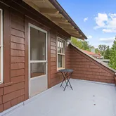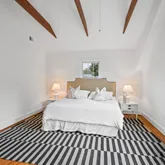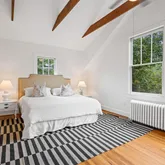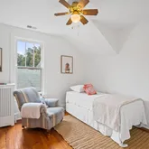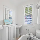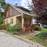 Upstairs, the property’s spacious layout features three generously sized bedrooms, and two full baths. The primary suite is a true retreat, complete cathedral ceilings, exposed wood beams, and a tiled en-suite bathroom with a glass stalled shower. The second bedroom offers plenty of flexible configuration options, and has a door to a balcony facing Spruce Ave. The third bedroom, next to the primary suite and opposite a full hallway bathroom with a claw-foot tub, could also serve as a study or a nursery.