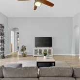 - Interior Features: Ceiling Fan(s), Eating Space In Kitchen, Kitchen/Family Room Combo, L Dining, Living Room/Dining Room Combo, Open Floorplan, Pest Guard System, Primary Bedroom Main Floor, Solid Surface Counters, Solid Wood Cabinets, Split Bedroom, Stone Counters, Thermostat, Tray Ceiling(s), Vaulted Ceiling(s), Walk-In Closet(s), Window Treatments